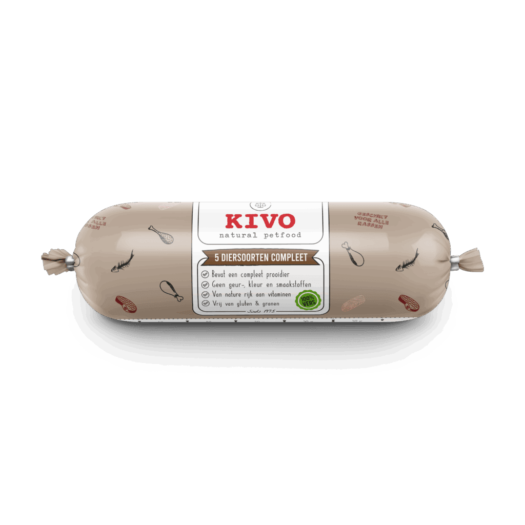 Deze complete maaltijd bestaat voor 40% uit rund, 20% uit eend, 20% uit kalkoen, 10% uit zalm en 10% uit paling. Dit wordt samengesteld uit: - 65% spiervlees - 20% orgaanvlees - 15% bot