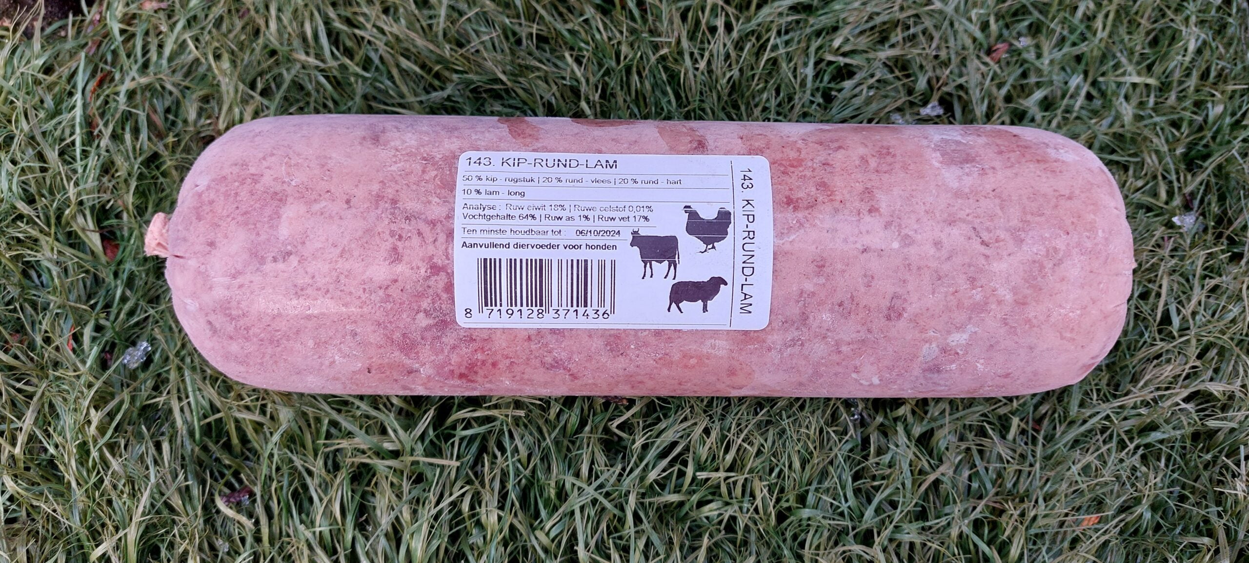Deze complete maaltijd bestaat uit 50% Kip rugstuk, 20% Rund vlees, 20% Rund hart, 10% Lam long